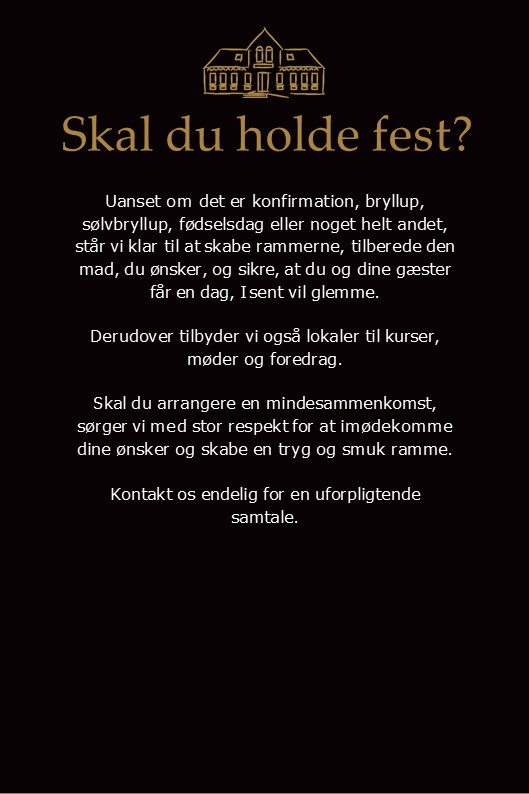 A la carte, takeaway og selskabsmenuer i huset ser du herunder – ring for priser på selskabsmenuerne UD af huset og ved spørgsmål eller andre ønsker!