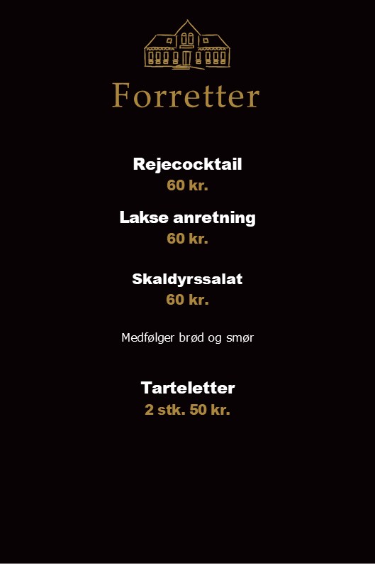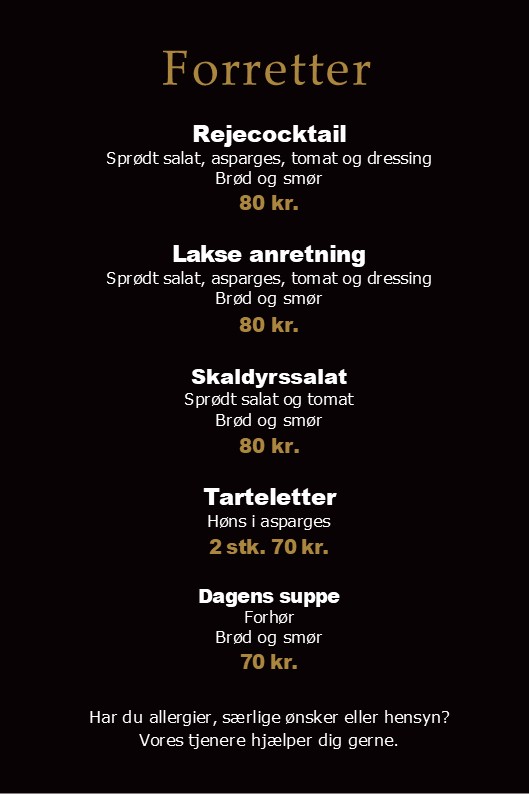 Tilkøb af forret +65,- kr. eller dessert + 60,- kr.