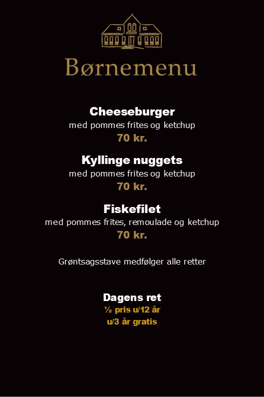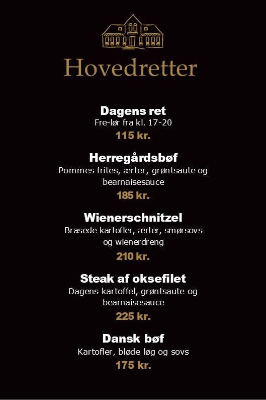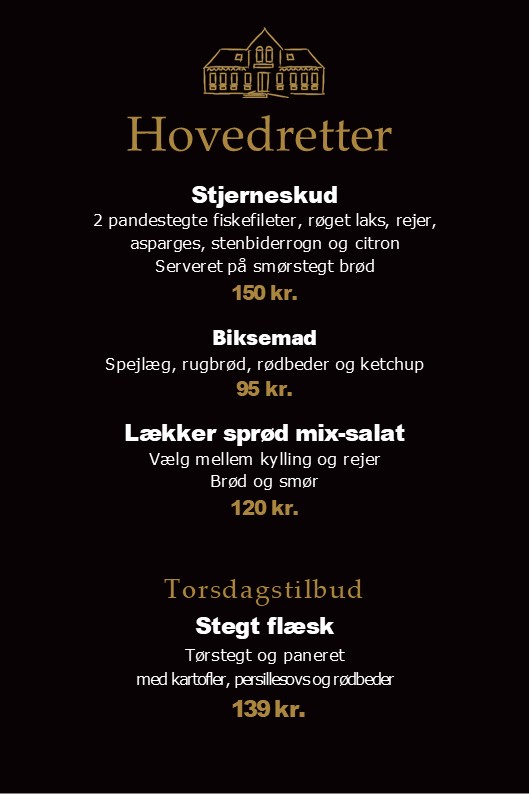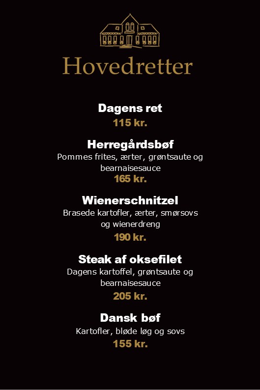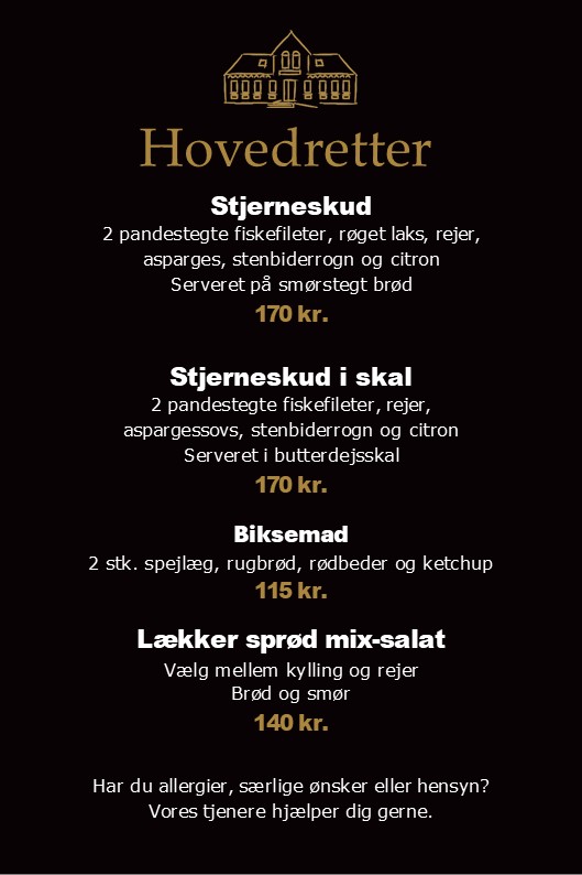 *Kalvesteg stegt som vildt med kartofler, waldorfsalat, surt og sødt, vildtflødesauce kr. 189,-