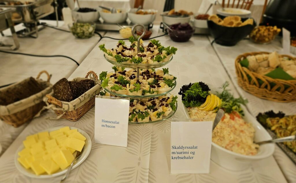 Skrambled eggs, pølser, bacon, lun Leverpostej, yoghurt med crunch, 3 slags pålæg, pandekager m/ahornsirup, 3 slags ost, 2 slags marmelade, frisk frugt, 3 slags brød, kaffe/the og juice kr. 215,-