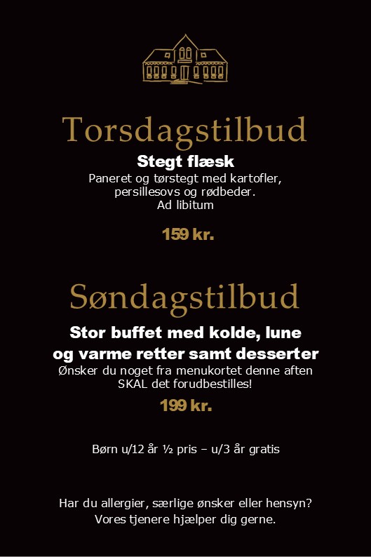 2 slags kød kr. 259,- / 3 slags kød kr. 289,- pr. kuvert